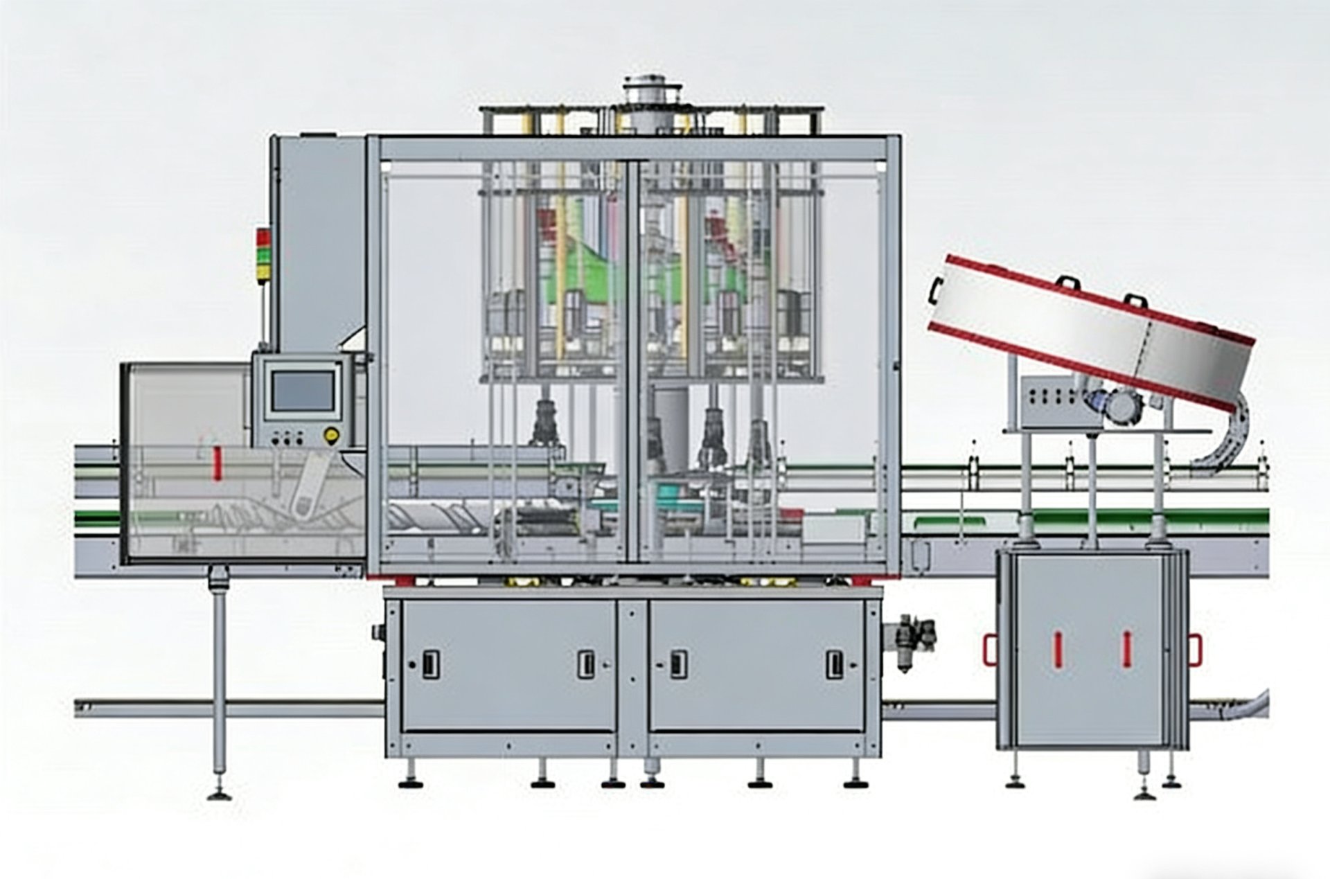 l Working principle: Continuous rotary operation with conformal screws for rapid and flexible bottle separation. The star wheel template guides bottles into the intermediate capping station for cap installation.